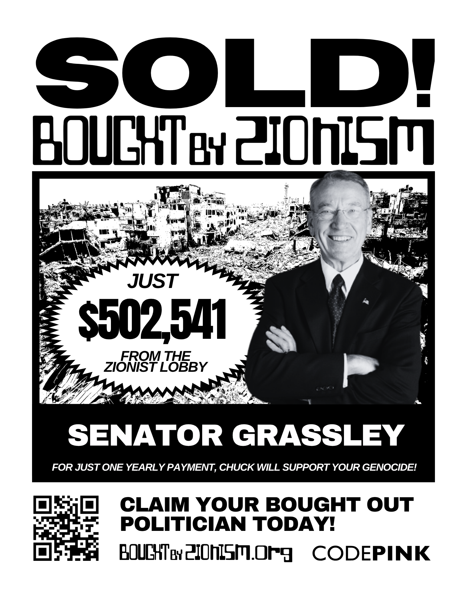 Senator Chuck Grassley, a Republican from Iowa, has been a vocal supporter of Israel, bolstered by over $502,541 in campaign contributions from AIPAC. This financial backing has heavily influenced his voting record, including his support for sending $3.8 billion in unconditional military aid to Israel. Grassley also voted to cut U.S. federal funding for the United Nations Relief and Works Agency (UNRWA), one of the few humanitarian organizations operating in Gaza. These decisions have come at a time when Gaza is experiencing widespread famine, disease, bombings, and a lack of proper healthcare or education. According to Lancet, the ongoing genocide in Gaza could result in the deaths of 180,000 Gazans, and Senator Chuck is helping fund it all.