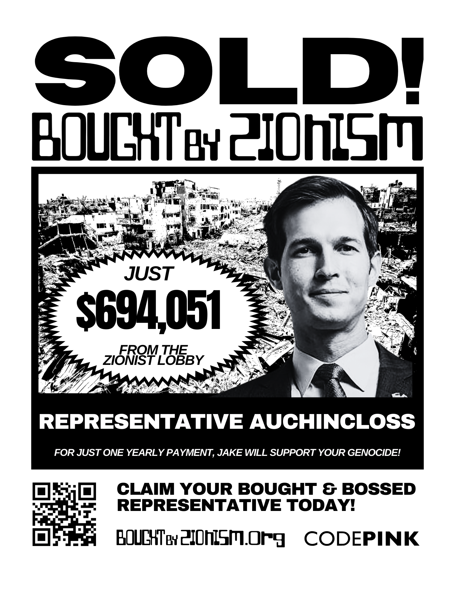 When Jake was asked about his views on how Israel has handled Gazans recently he responded, “This is about a liberal democracy versus an evil terrorist cult.” Then he continued to admit that his support for Israel has not changed despite Israel’s genocide of Palestinians. In an interview with the Jewish Insider in July 2024, Auchincloss was asked if Israel can defeat Hamas to which he responded, “Yes.” Jake continued by stating, “People like to say, ‘Oh, you can’t defeat an ideology,’ Does that mean that there is no human being in Gaza who subscribes to Islamist terrorism? No, of course, not.” Jarring Jake is backing Israel’s use of collective punishment in Gaza, and will use his voting power to fund it, like voting against the Bush/Tlaib Ceasefire resolution and an arms embargo to Israel. Jake also voted against the McCollum Palestinian rights resolution, which bars the Israeli government from using U.S. taxpayer funds in the Occupied West Bank for the military detention, mistreatment, or abuse of Palestinian children in Israeli custody.