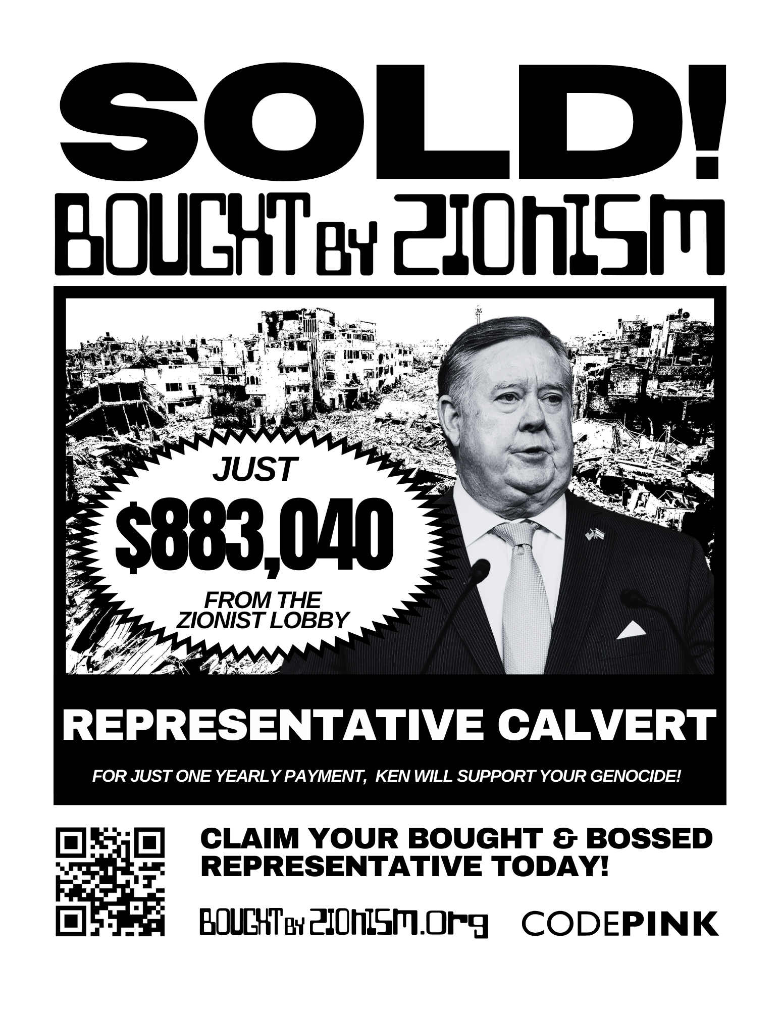 California Representative Ken Calvert has gone above and beyond to secure Israel’s military interests in Congress. The price tag on Callous Calvert’s soul costs AIPAC and other Israeli lobby groups $883,040. It’s no surprise that Callous Calvert signed on to Strengthening the Israel-U.S. Alliance Act which provides Israel with $3.8 billion for their genocide operation in Palestine. Ken defended his support for the act stating, “The world is in chaos, Americans have been killed, and our allies and partners are dying on the front lines everyday.” Nowhere in Ken's statement is there a mention of the 39,000 innocent plus Palestinians murdered, including over 15,000 children in that death toll. There was no outcry from CA Rep. Ken when the 17 year old Palestinian, Florida born US citizen Mohammad Khdour's life was taken in February 2024 by IOF soldiers. Then in May 2024, Callous Calvert introduced the Israel Security Assistance Support Act, H.R. 8369, which ensures there are no federal funds withheld from Israel used for their military.